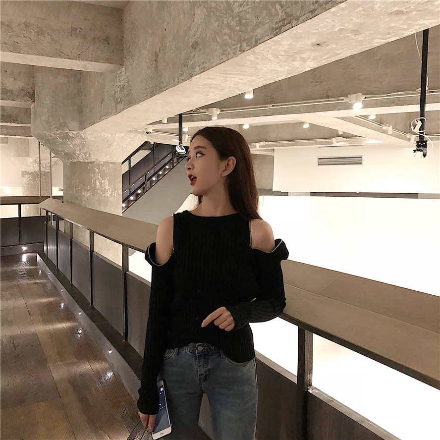 chic早秋毛衣慵懶風網紅同款性感氣質小心機鏤空露肩長袖針織衫女
