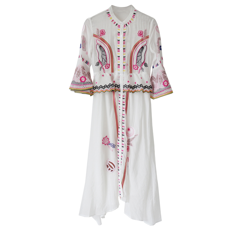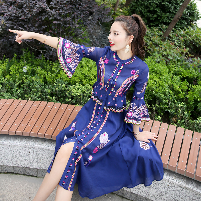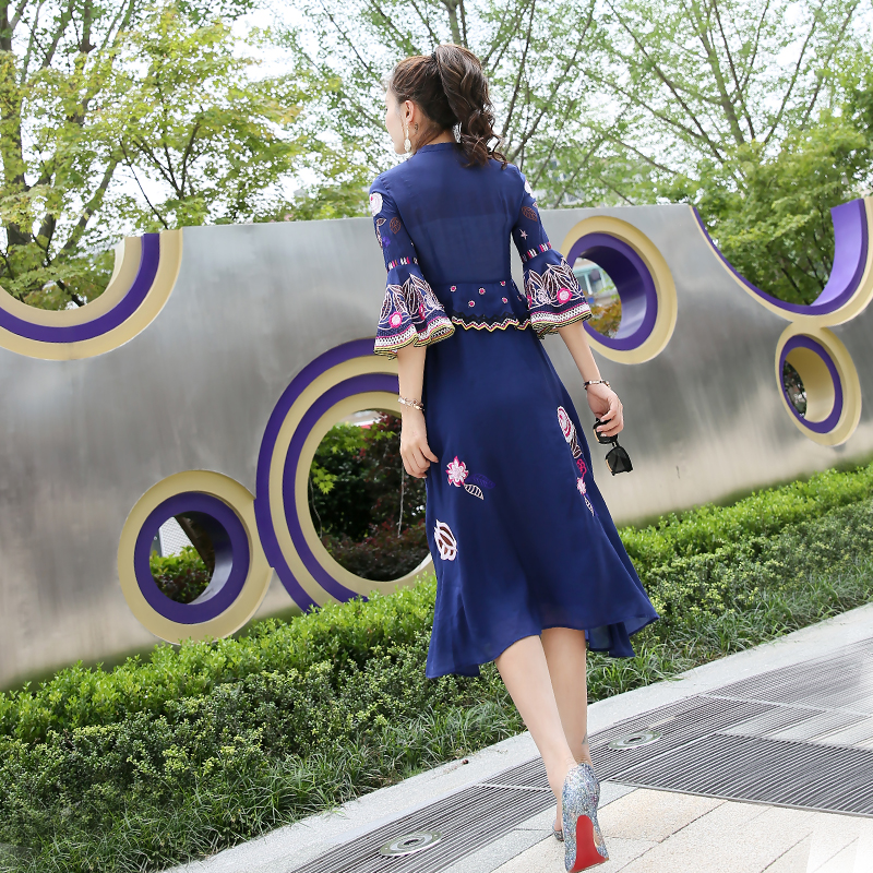 夏季新款復古刺繡七分花瓣袖連衣裙女夏氣質名媛拼接中長款裙子潮