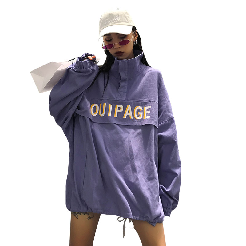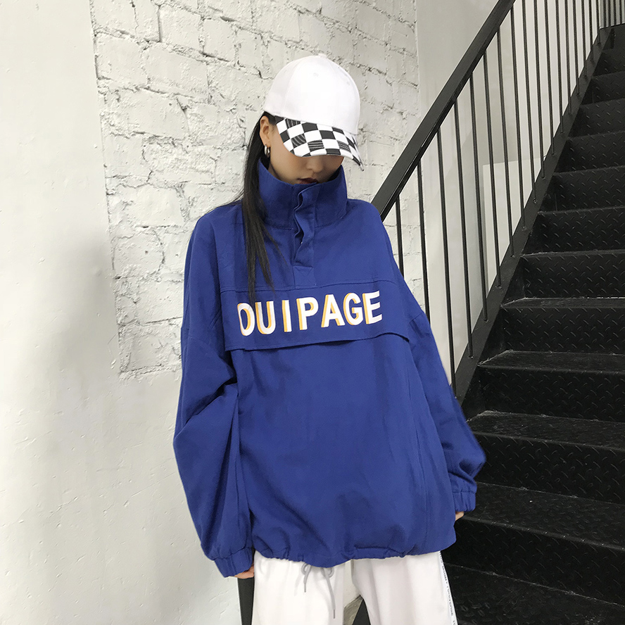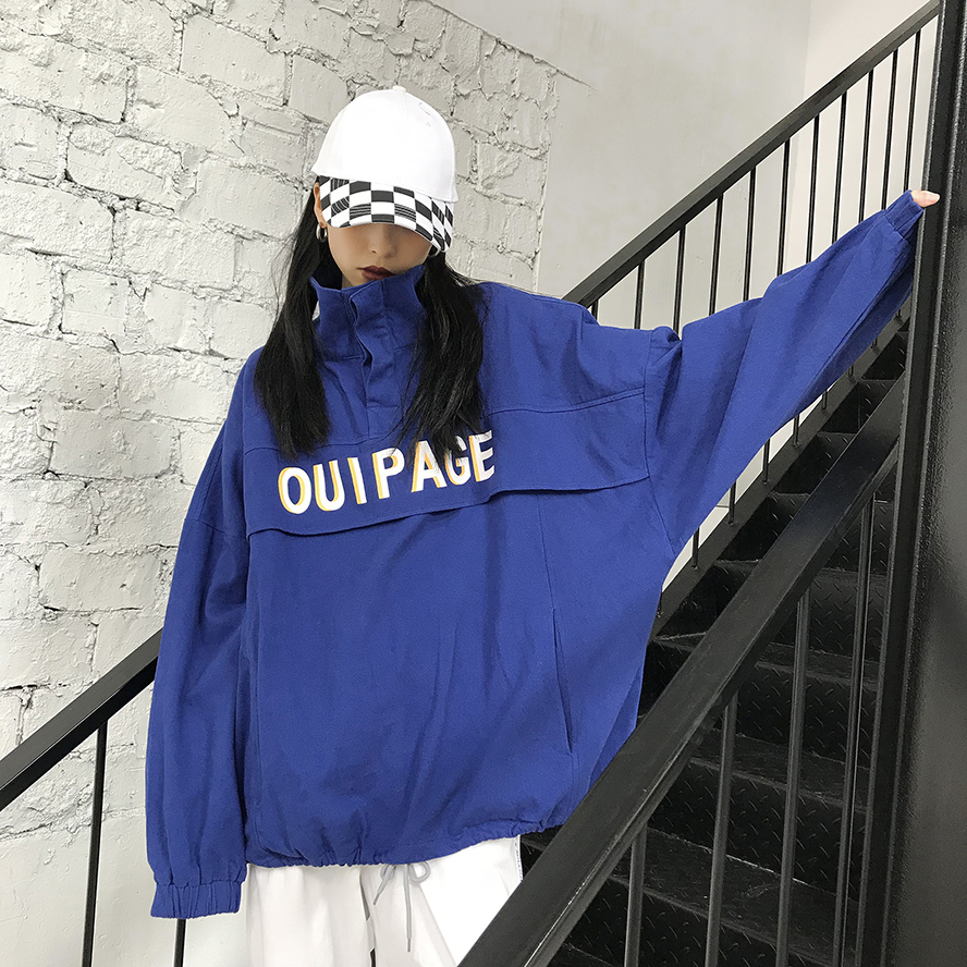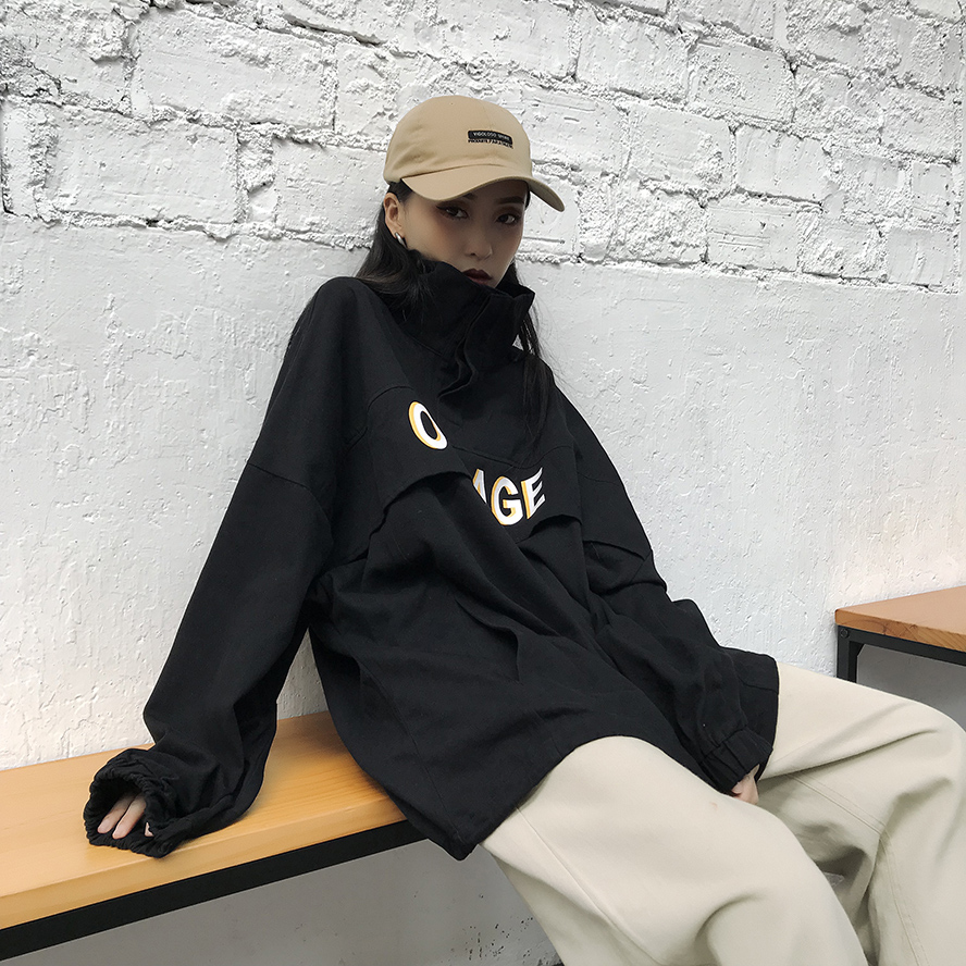 / 秋季女裝韓版原宿風寬松字母立領套頭衛衣中長款長袖休閑上衣外套