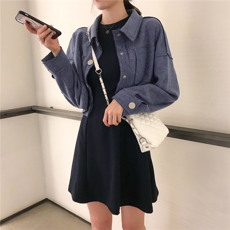 慵懶風秋裝女2018新款復古夾克牛仔外套女春秋+純色V領吊帶連衣裙