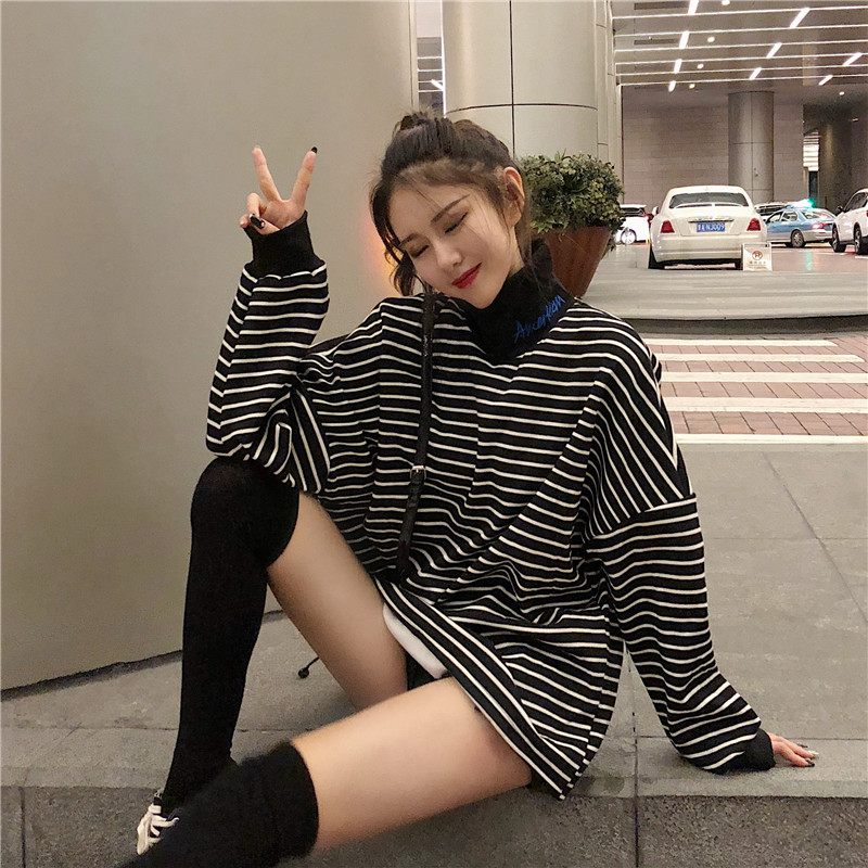 chic寬松百搭刺繡高領加厚加絨條紋套頭衛衣女秋冬2018新款上衣潮