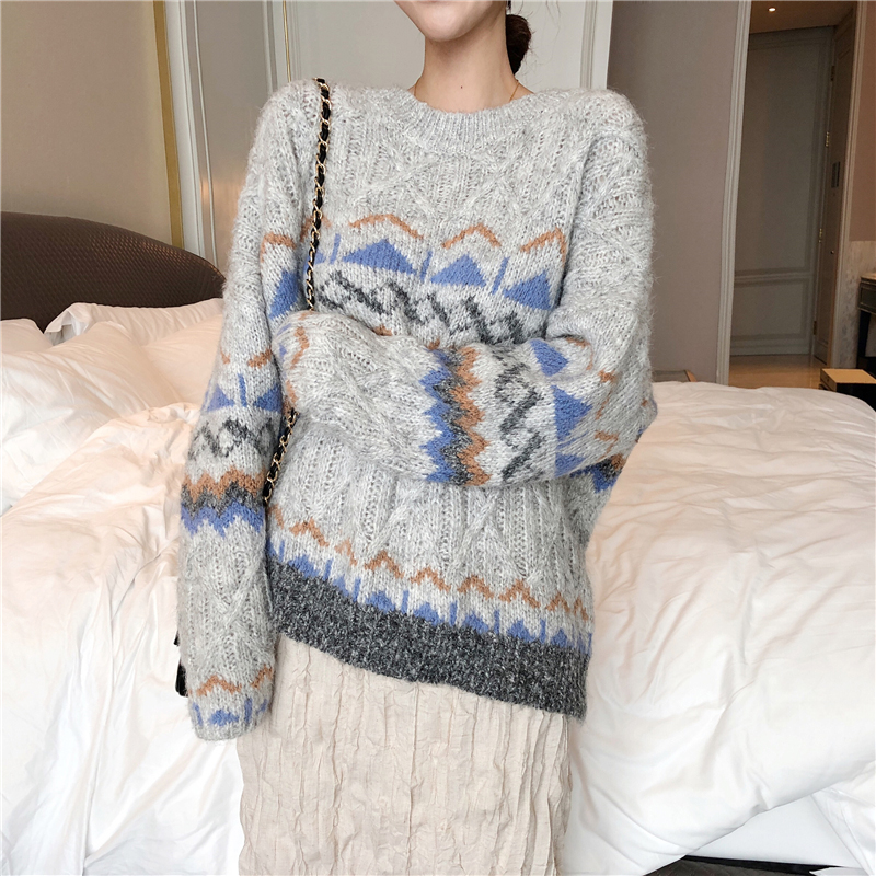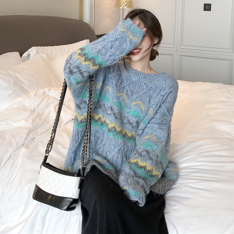 慵懶風麻花套頭針織衫女秋冬裝2018新款韓版時尚寬松拼色毛衣外套