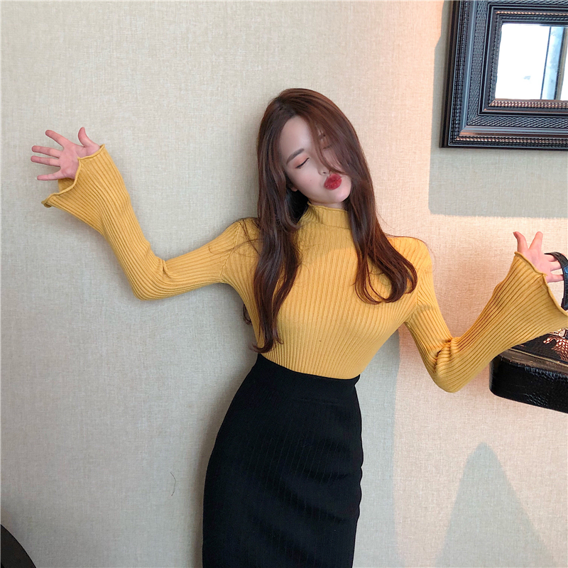 韓風時尚多色百搭喇叭袖加厚毛衣女秋冬2018新款打底針織衫上衣潮
