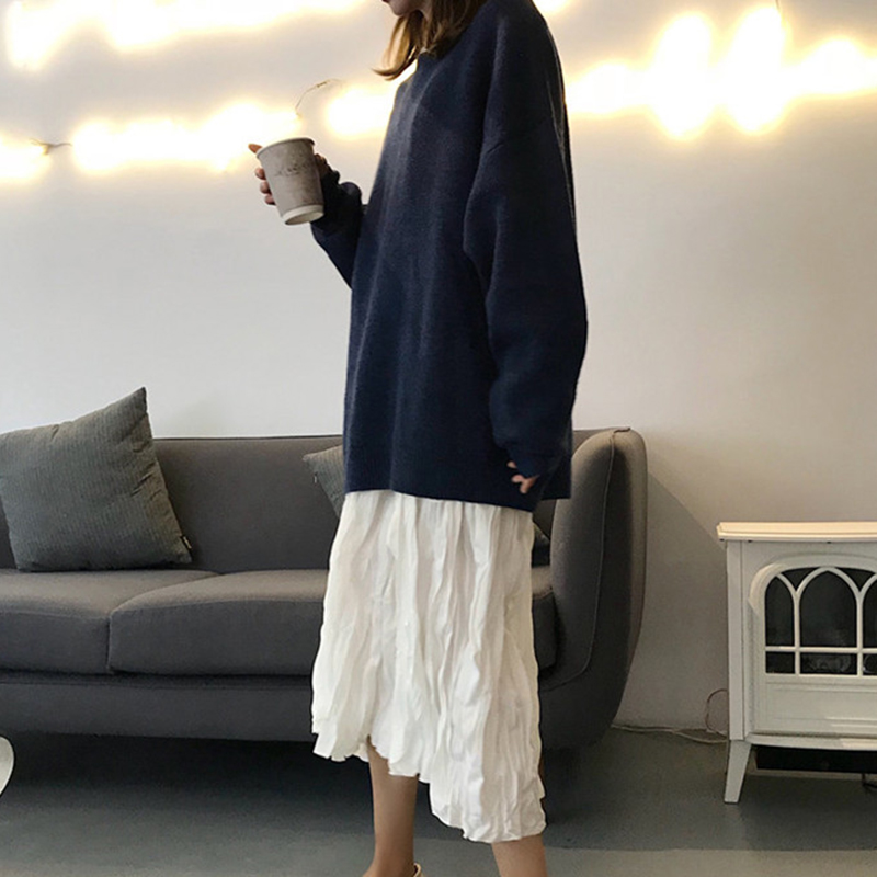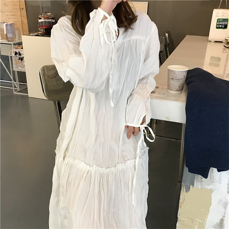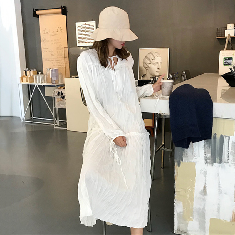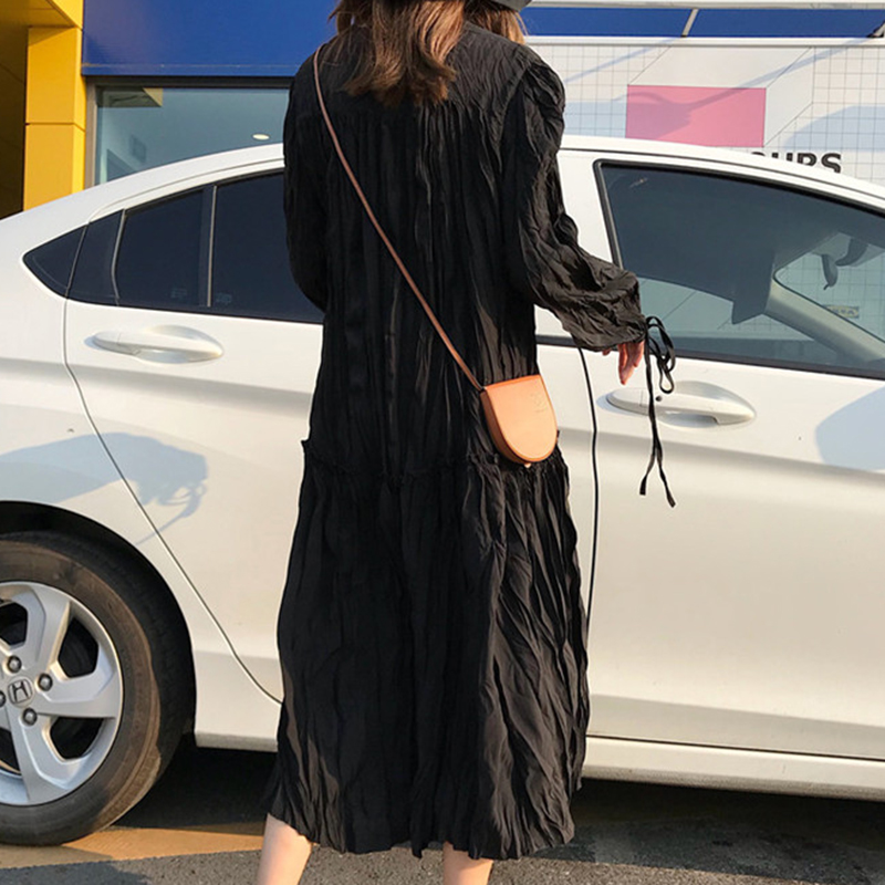 / 時尚褶皺系帶長袖連衣裙女秋裝新款溫柔黑色A字裙子寬松中長裙子
