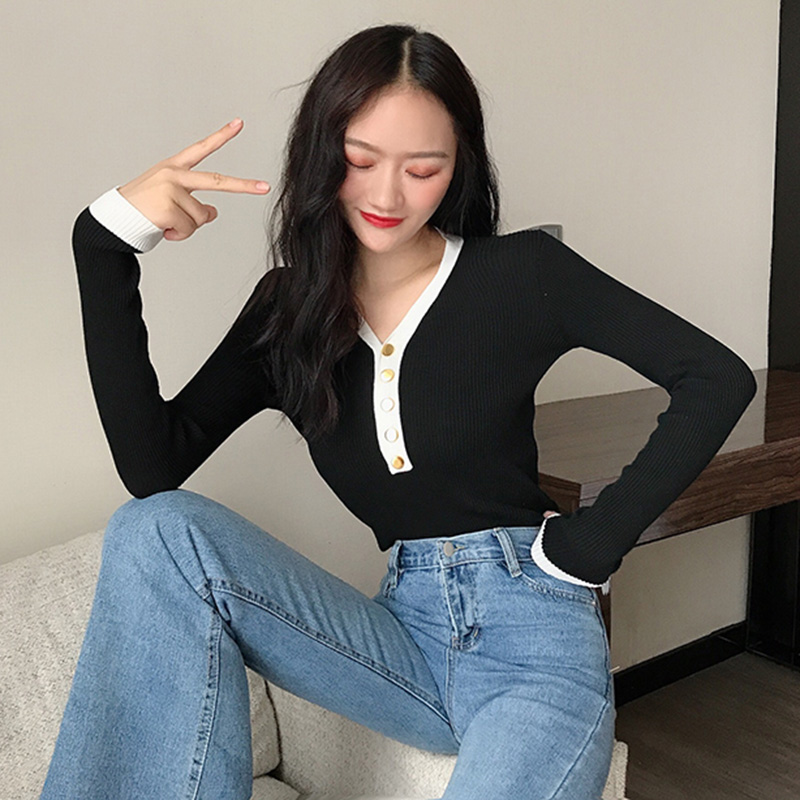 氣質修身針織衫秋裝女2018新款港味時尚黑色短上衣長袖簡約打底衫