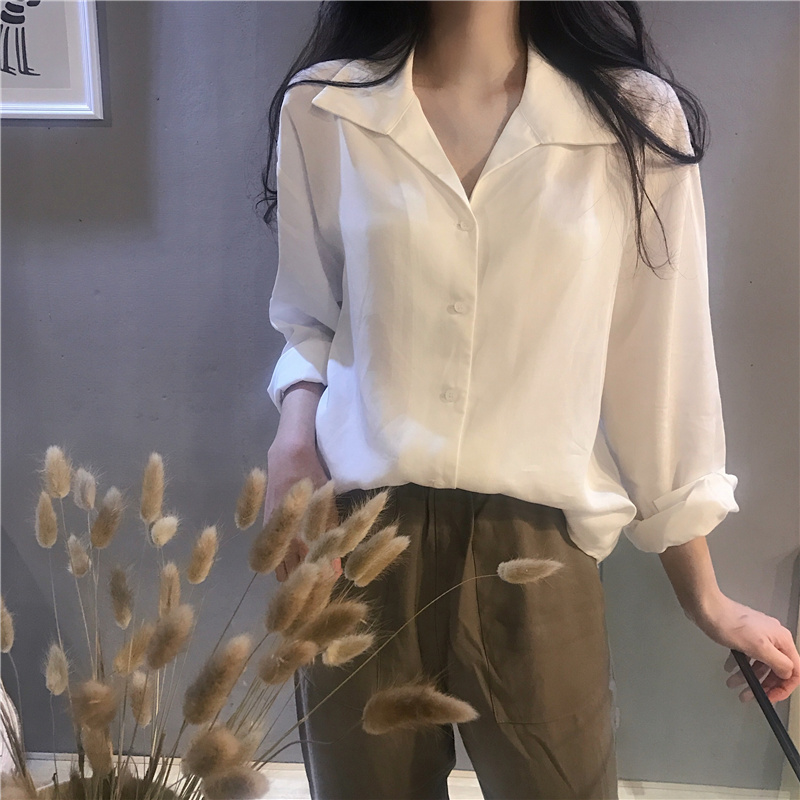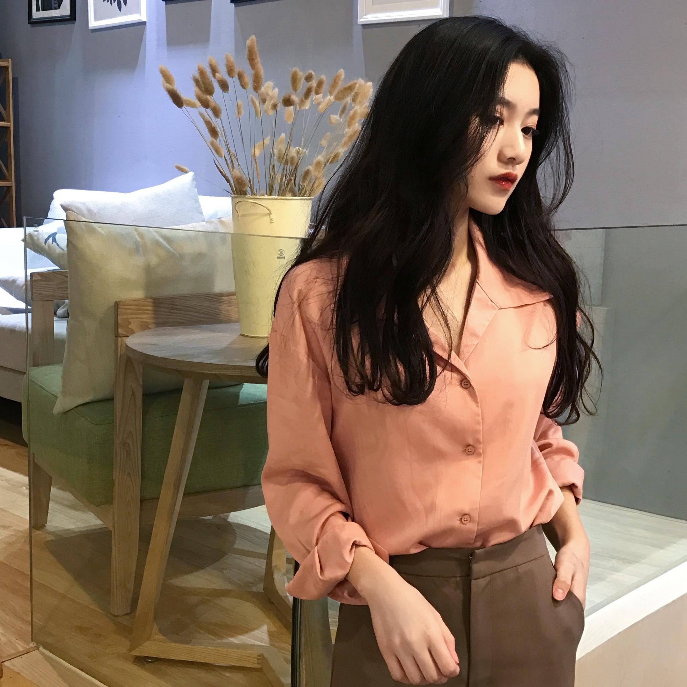 / 襯衣女2018新款chic韓國簡約純色V領直筒百搭顯瘦長袖單排扣上衣