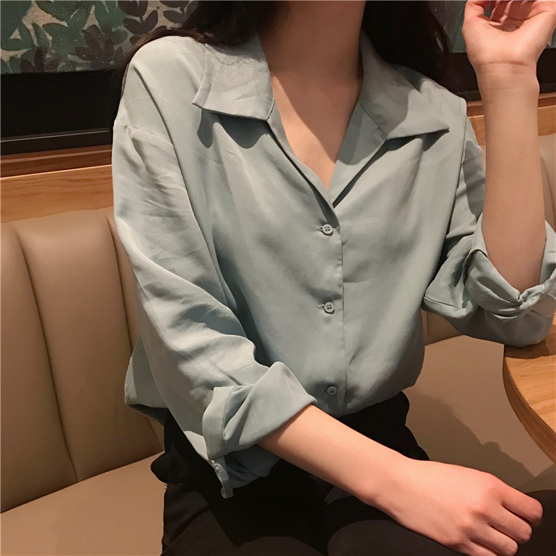襯衣女2018新款chic韓國簡約純色V領直筒百搭顯瘦長袖單排扣上衣