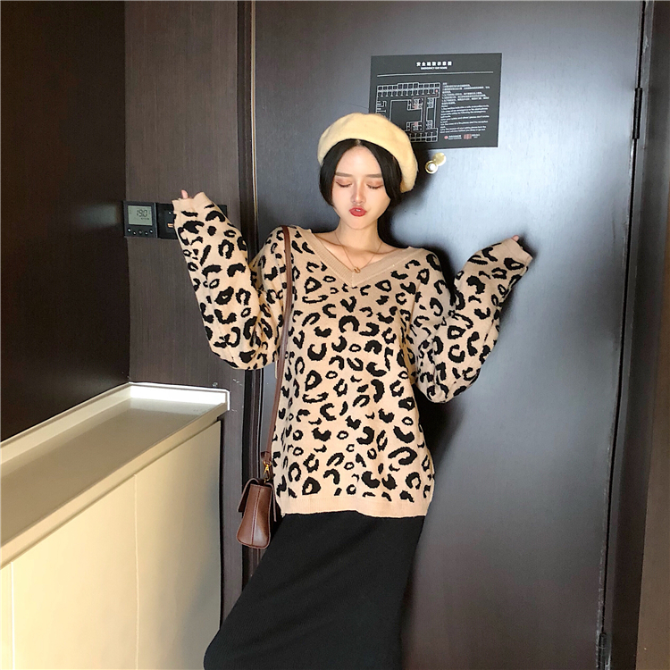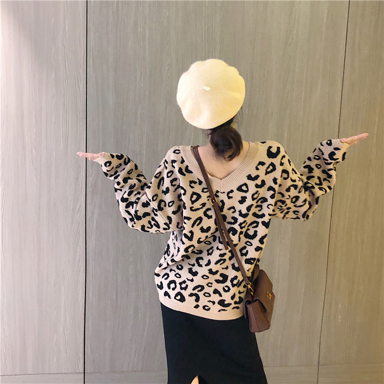 毛衣女2018新款豹紋套頭針織衫慵懶風寬松oversize中長款毛衣女潮