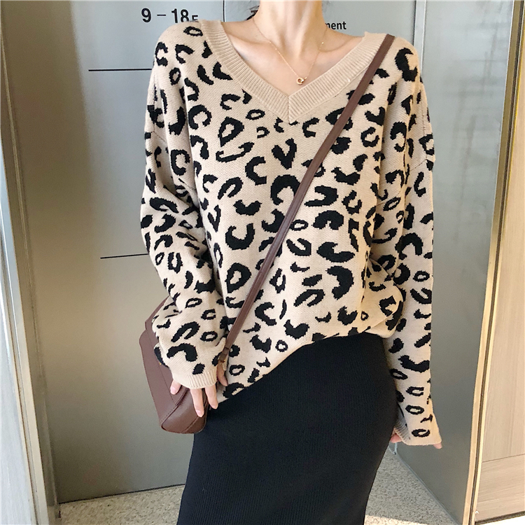 chic慵懶風網紅毛衣女2018新款寬松百搭虎紋氣質套頭V領針織衫潮