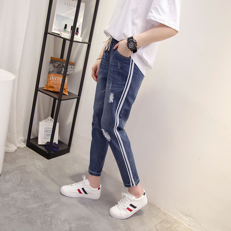 / 破洞牛仔褲女春夏季新款寬松顯瘦條紋低腰褲子韓版系帶小腳褲