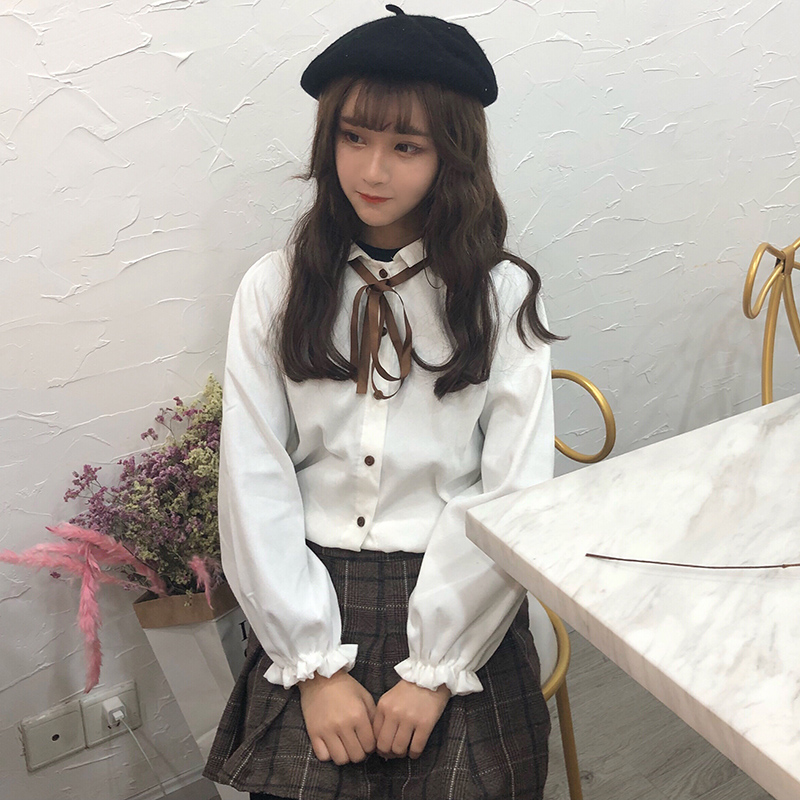 / 冷系女秋裝2018新款韓范學院風清新燈芯絨襯衣蝴蝶結系帶襯衫上衣