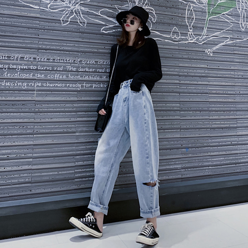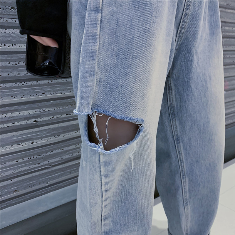 高腰個性破洞闊腿褲女秋冬裝2018新款韓版學生寬松顯瘦牛仔長褲子