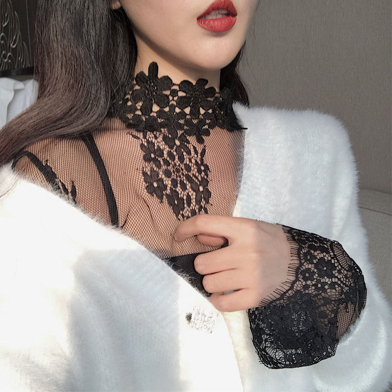 / 秋冬新款chic風透視蕾絲花邊打底衫鏤空高領網紗喇叭袖內搭上衣女
