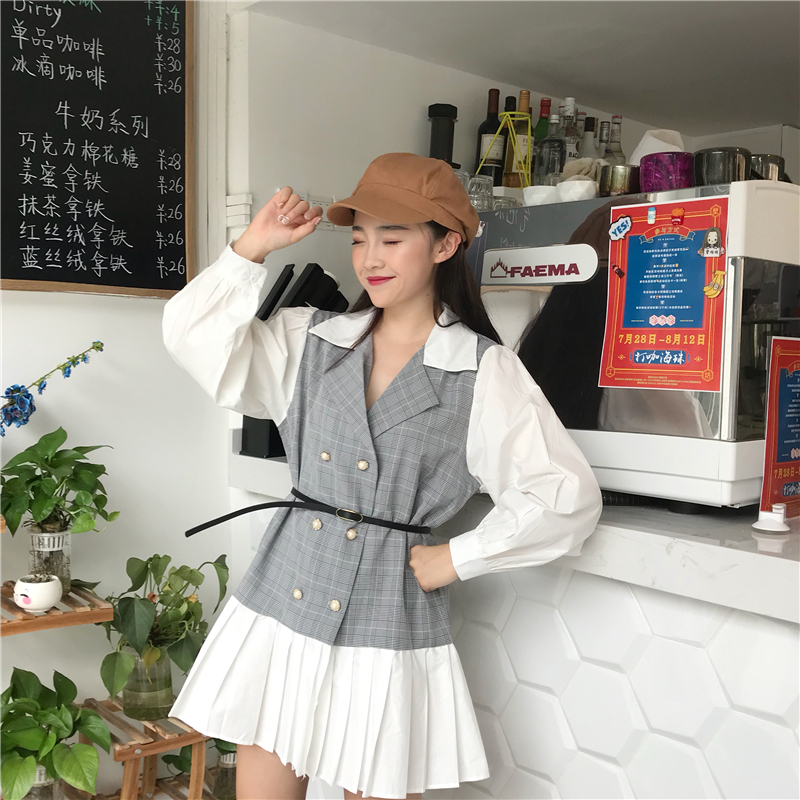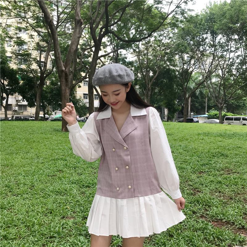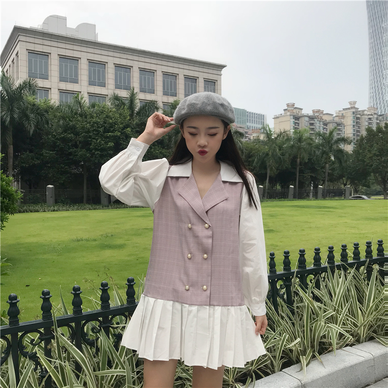 / 秋季女裝韓版中長款復古格子西裝領假兩件寬松長袖百褶連衣裙短裙
