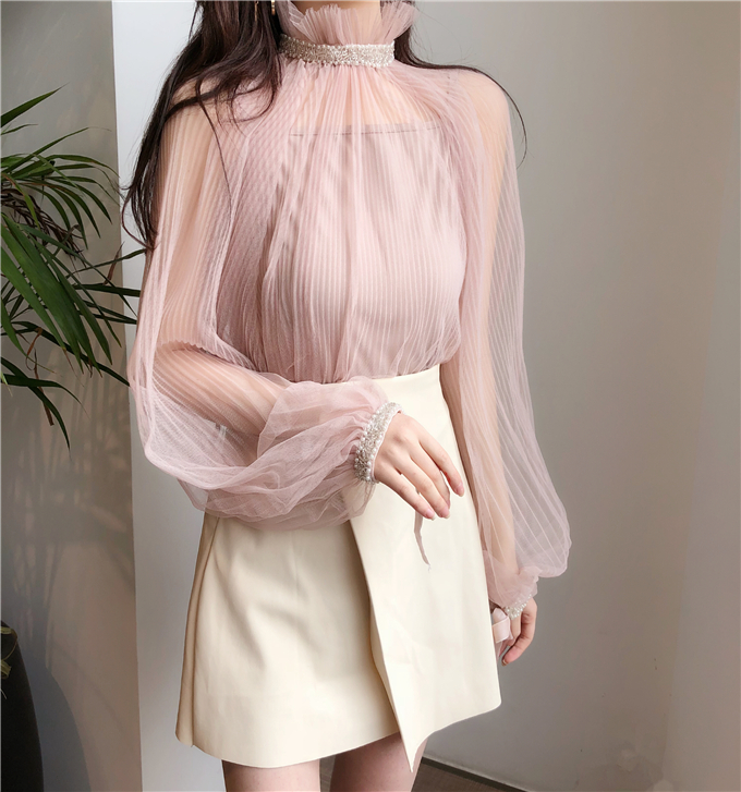 / 早春新款女裝氣質宮廷袖透視網紗釘珠罩衫+內搭小吊帶學生兩件套