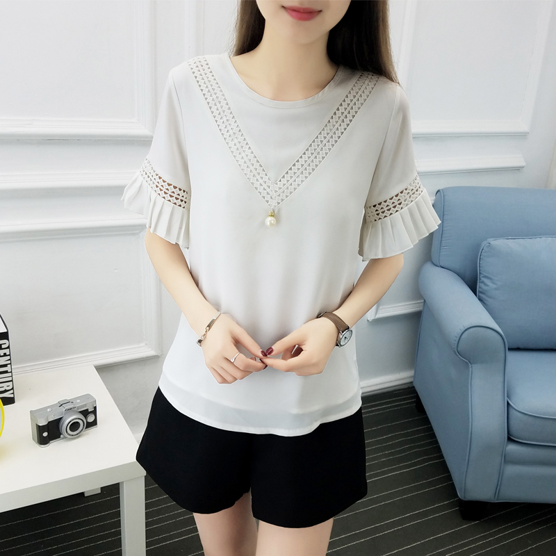 雪紡衫女短袖夏裝新款韓版喇叭袖甜美蕾絲寬松荷葉邊雪紡上衣