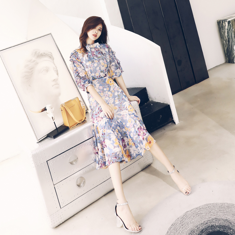 溫柔風中長款印花五分袖收腰荷葉邊連衣裙女夏2018新款碎花裙子潮