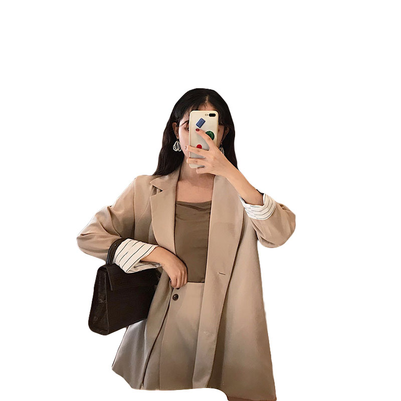 時尚chic小西裝外套寬松港風復古西服+V領針織吊帶連衣裙兩件套潮