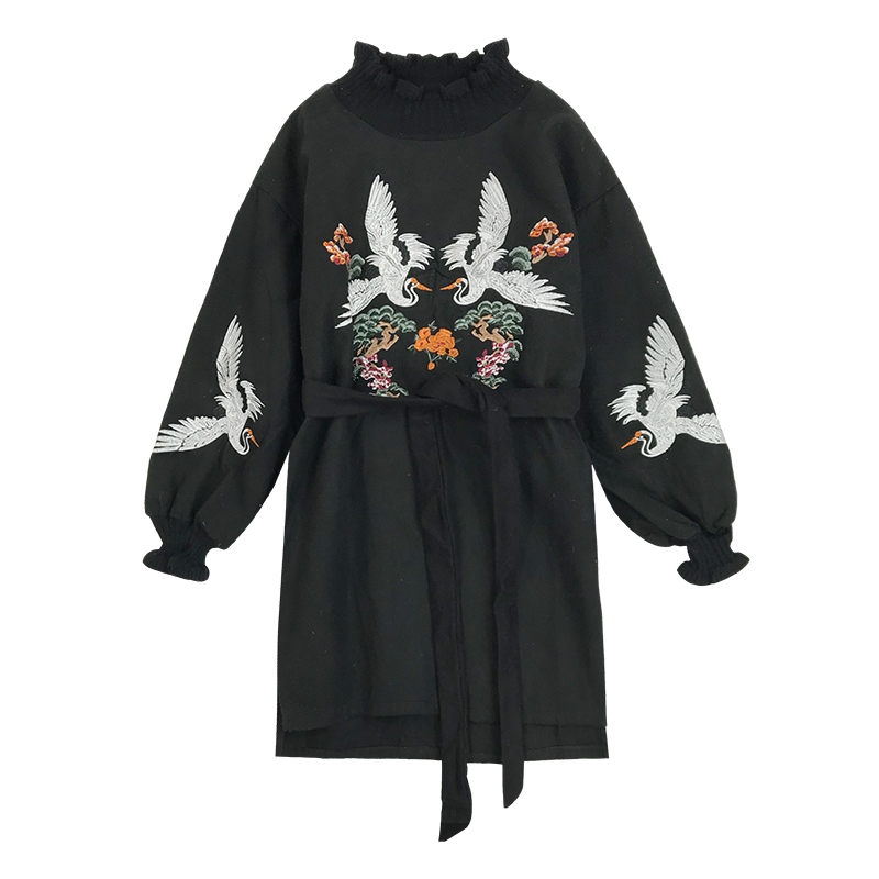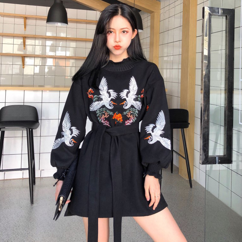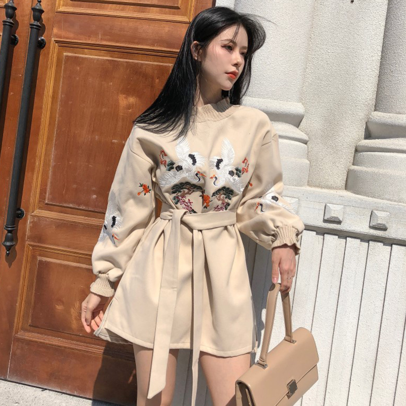 秋冬女裝2018新款韓版復古風刺繡寬松egg裙收腰顯瘦長袖連衣裙子