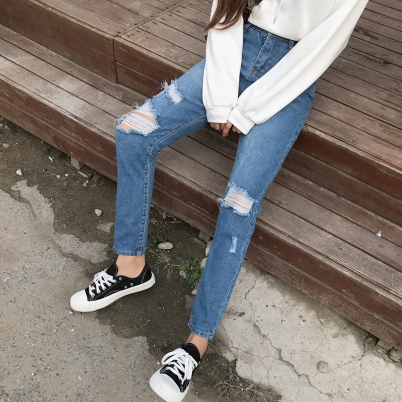 怪味少女褲秋冬裝2018新款韓版個性磨破洞直筒褲高腰顯瘦牛仔長褲