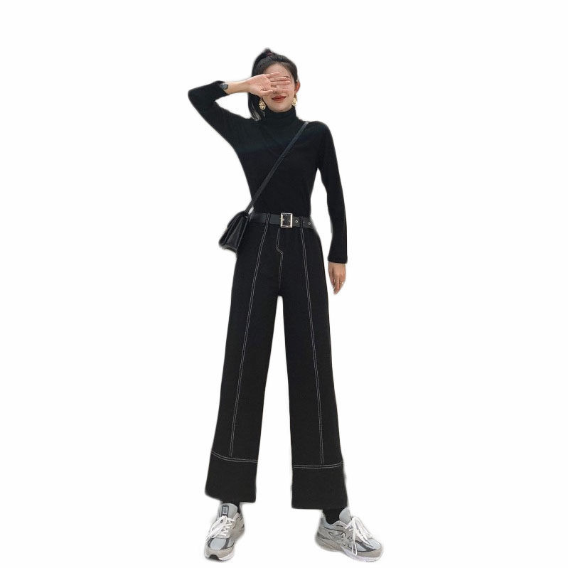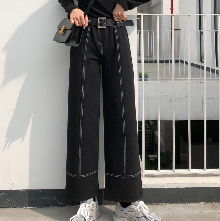 復古韓國chic風百搭高腰顯瘦毛呢直筒闊腿褲女秋冬2018新款配皮帶
