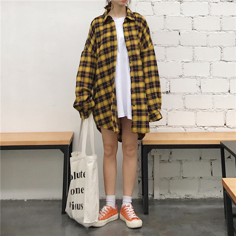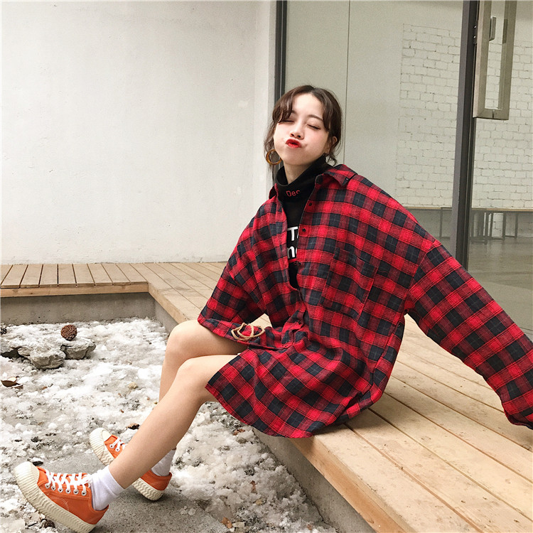 秋裝女裝2018新款韓版寬松顯瘦中長款格子襯衫休閑長袖襯衣上衣潮