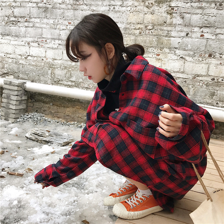 / 秋裝女裝2018新款韓版寬松顯瘦中長款格子襯衫休閑長袖襯衣上衣潮
