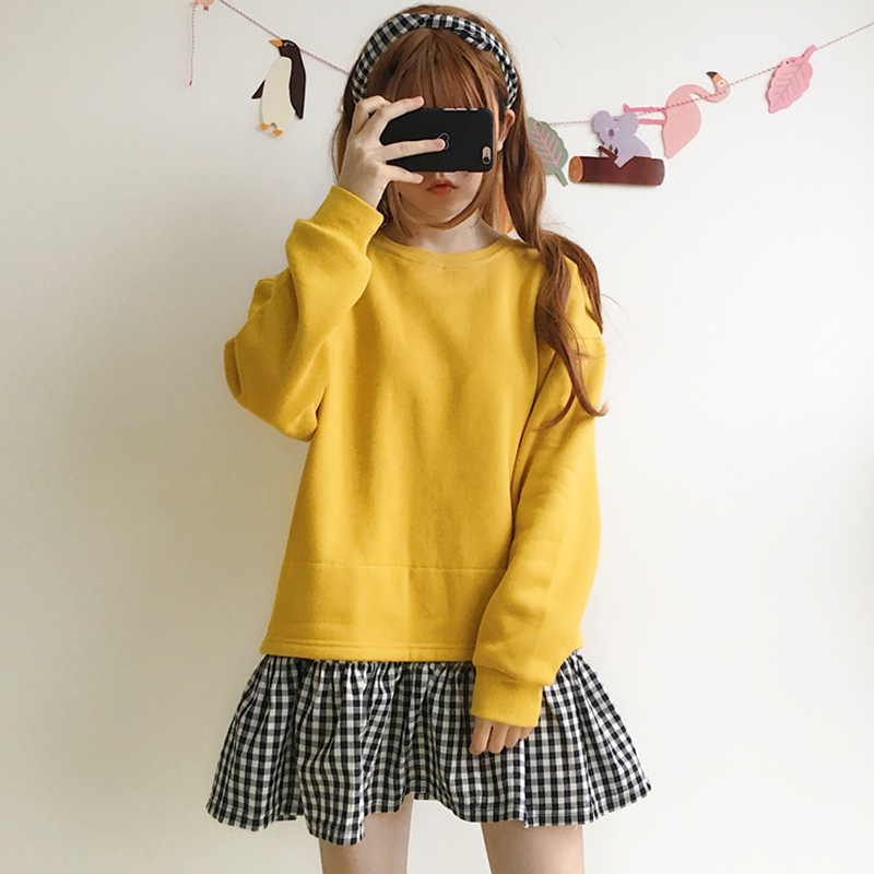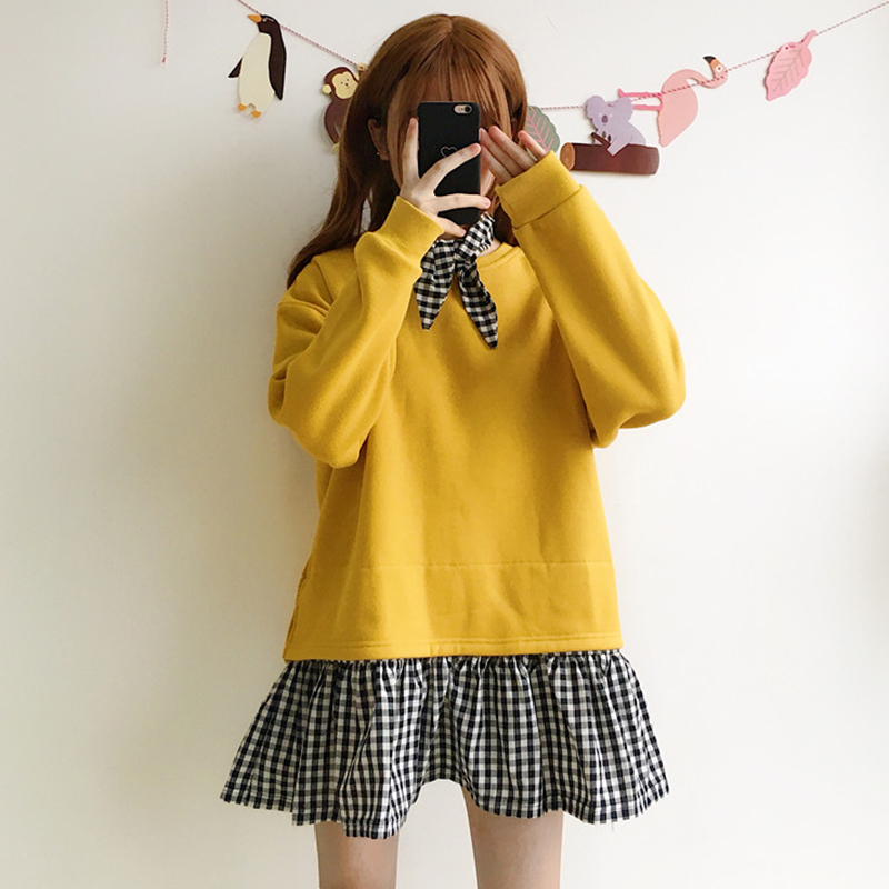 eeg假兩件拼接格子衛衣裙女冬裝2018新款韓版寬松加絨套頭連衣裙