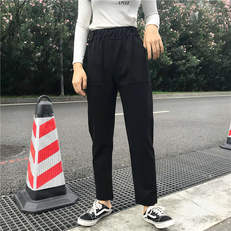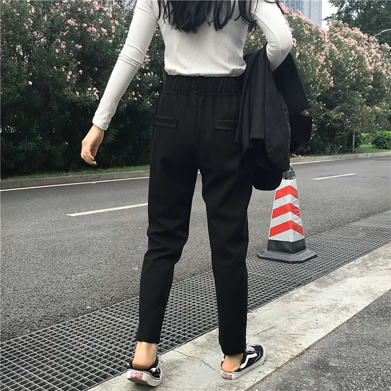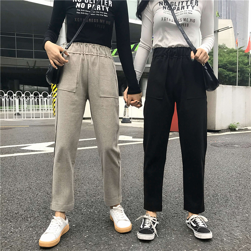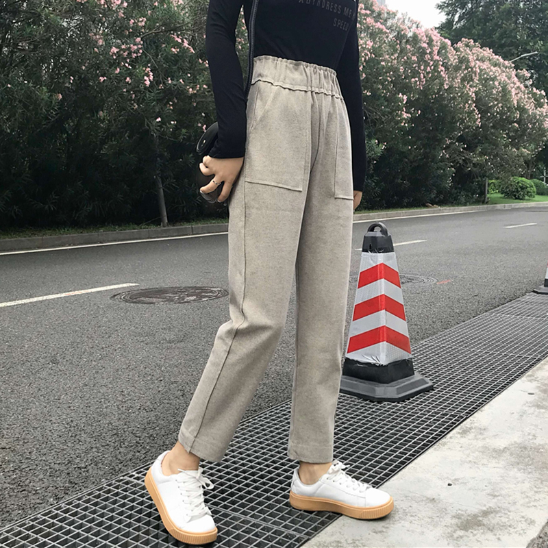 秋冬女2018新款寬松休閑小腳褲子毛呢松緊高腰九分哈倫褲冷系女裝