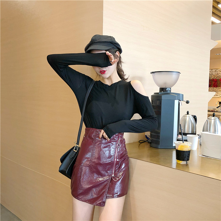 秋裝女2018新款套裝時尚兩件套氣質百搭單邊露肩長袖T+顯瘦PU皮裙