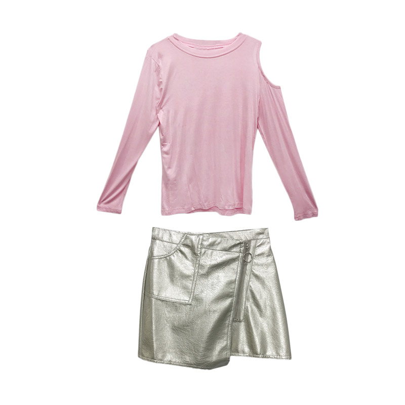 白色T|粉色T|黑色T|酒紅半裙|黑色半裙|銀色半裙