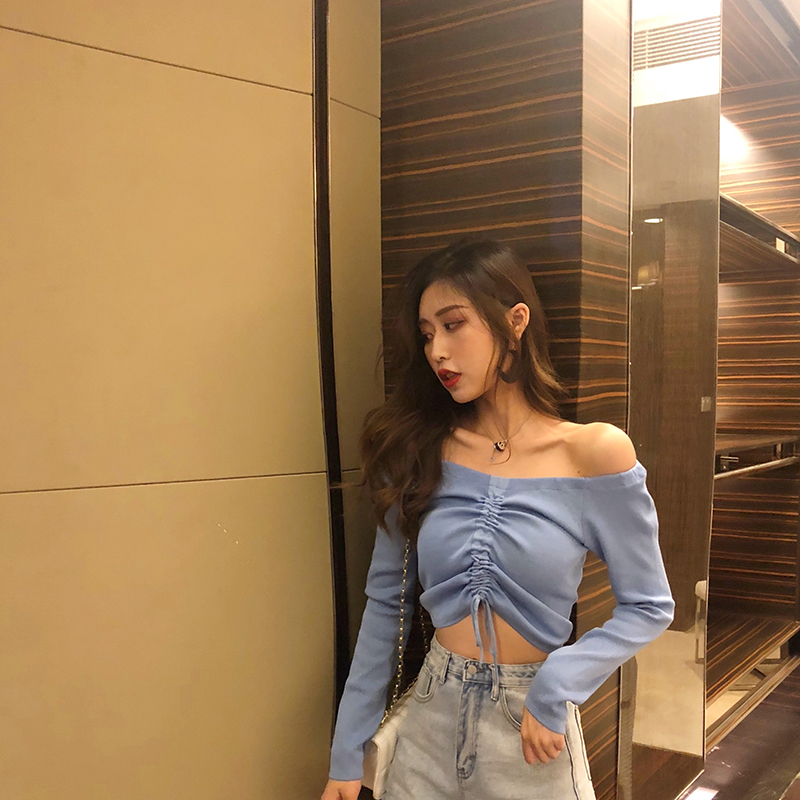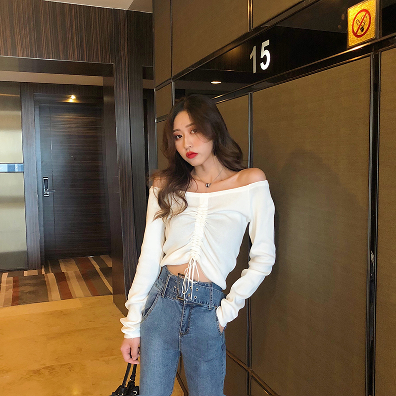 / 復古韓國chic風氣質時尚純色百搭長袖抽繩系帶一字肩上衣針織衫女