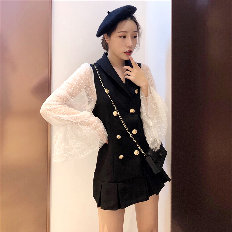 / 韓版修身顯瘦短裙chic氣質喇叭袖拼接雙排扣連衣裙秋裝2018新款女