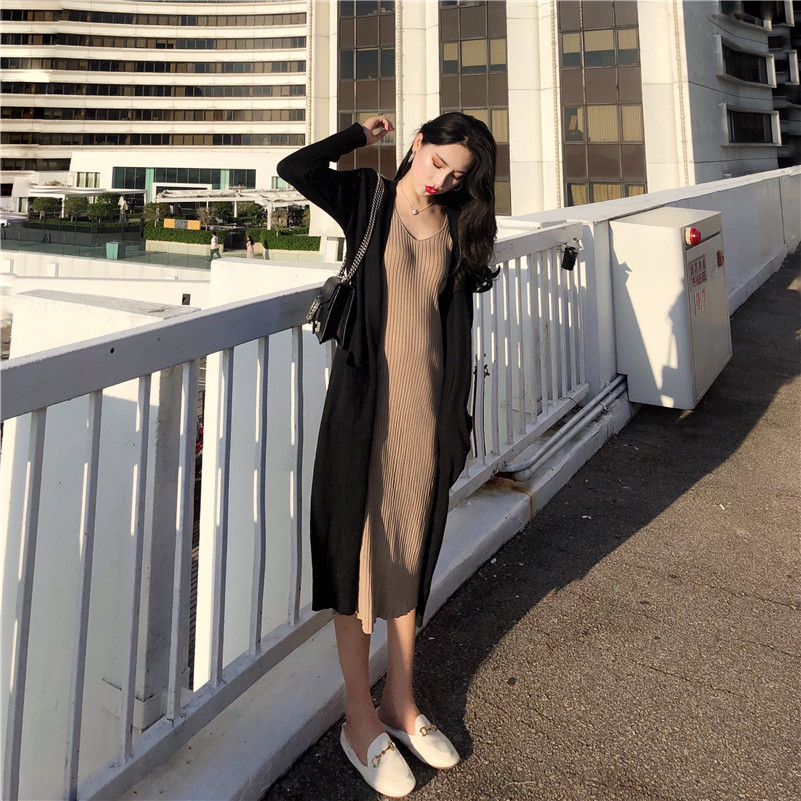 / 慵懶中長款加厚寬松毛衣外套針織開衫外搭吊帶修身顯瘦針織連衣裙