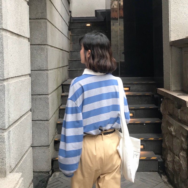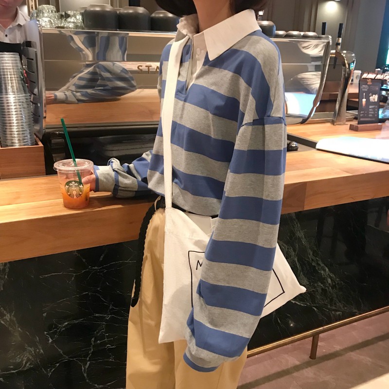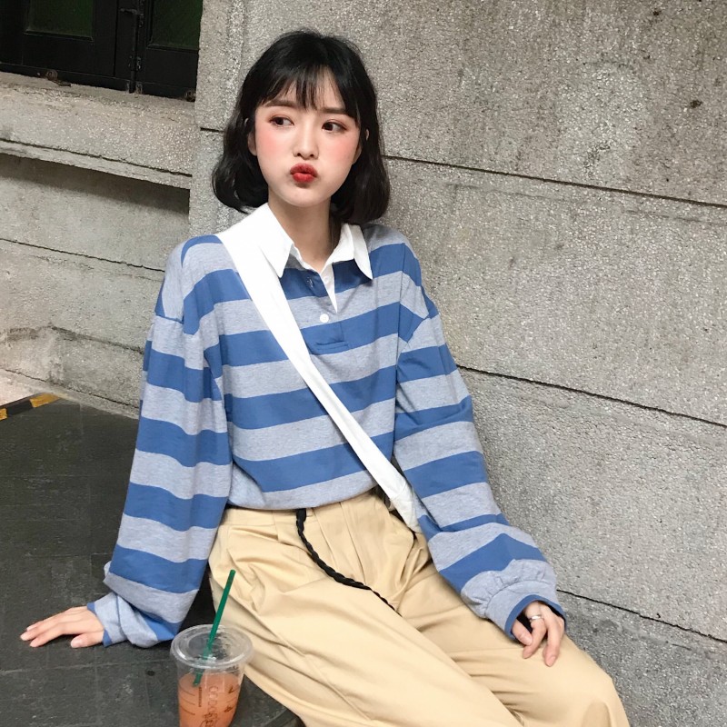 / 秋季女裝韓版復古學院風撞色條紋polo領襯衣寬松長袖休閑襯衫上衣