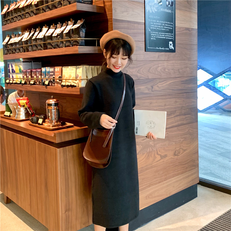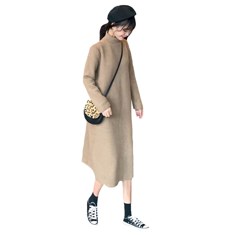 秋冬女裝韓版中長款寬松打底裙純色半高領長袖連衣裙長裙學生裙子