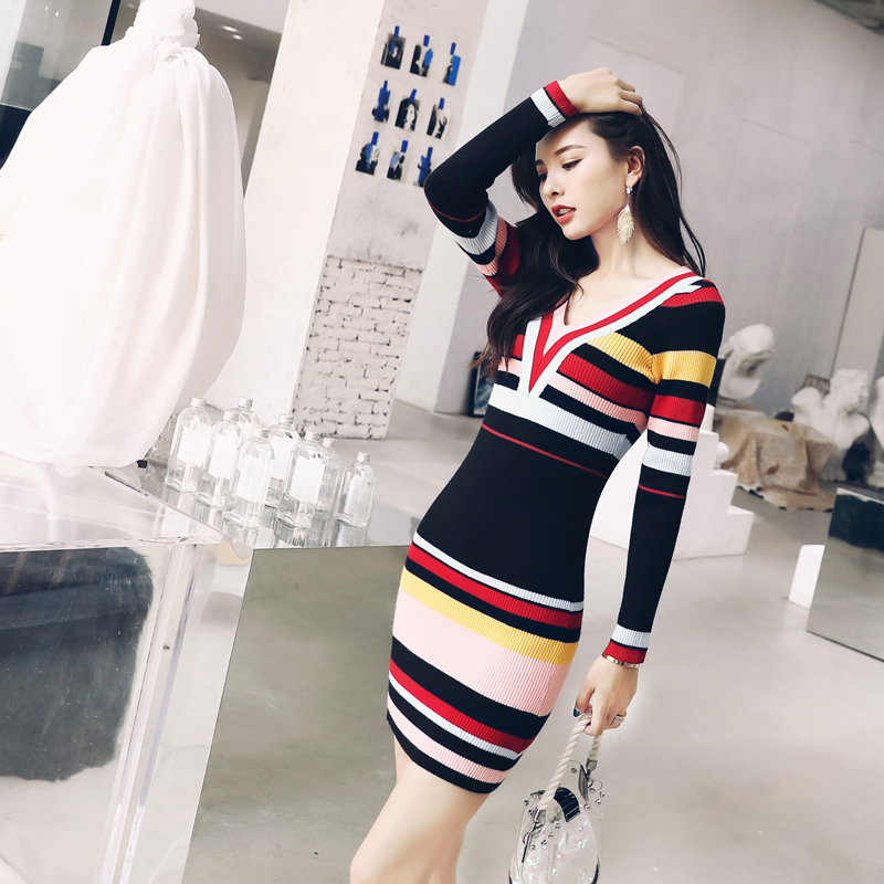 / 2018秋季新款修身V領裙子短款撞色針織長袖包臀連衣裙女A字連衣裙