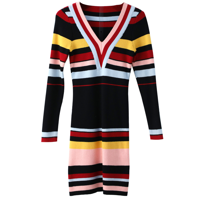 2018秋季新款修身V領裙子短款撞色針織長袖包臀連衣裙女A字連衣裙
