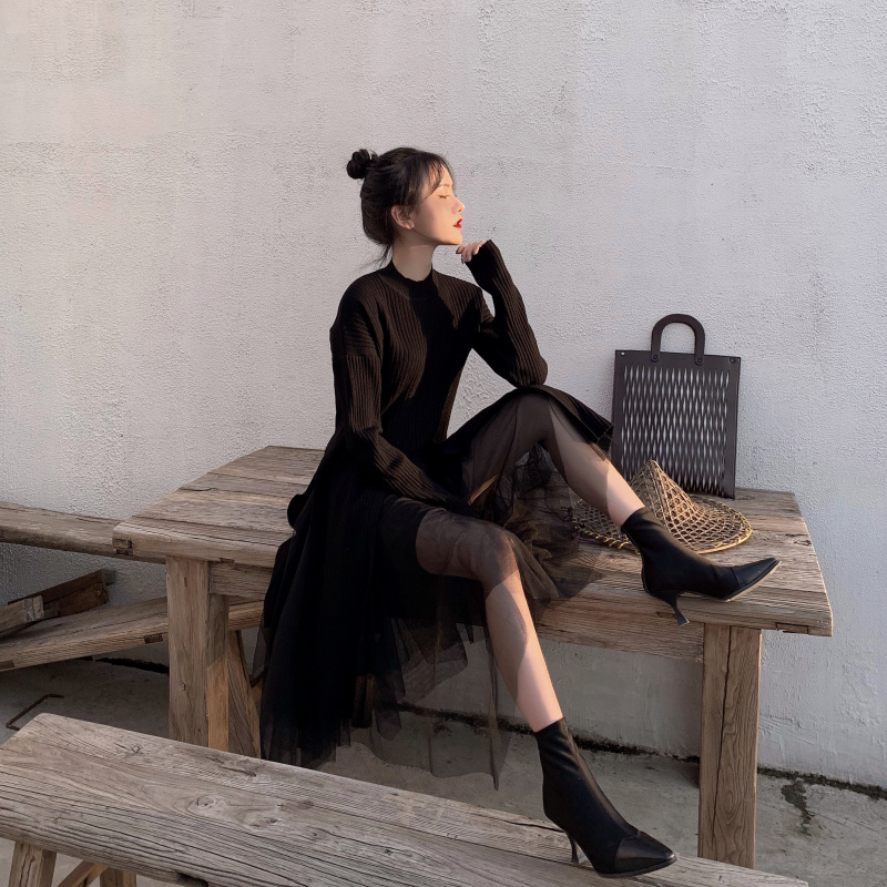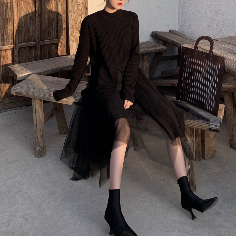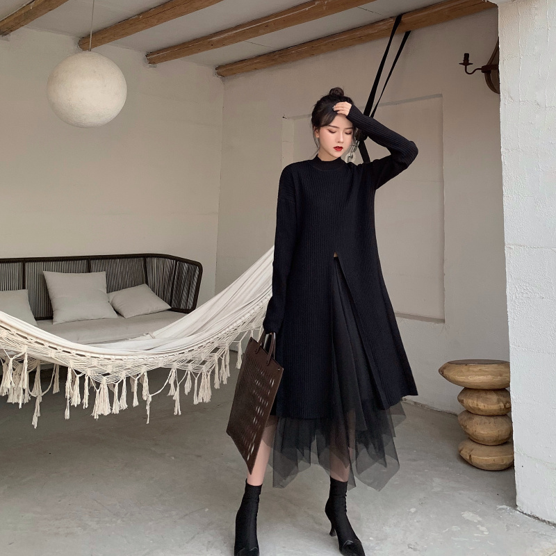 / 秋冬新款開叉長袖針織上衣不規則高腰中長款網紗裙時尚套裝兩件套