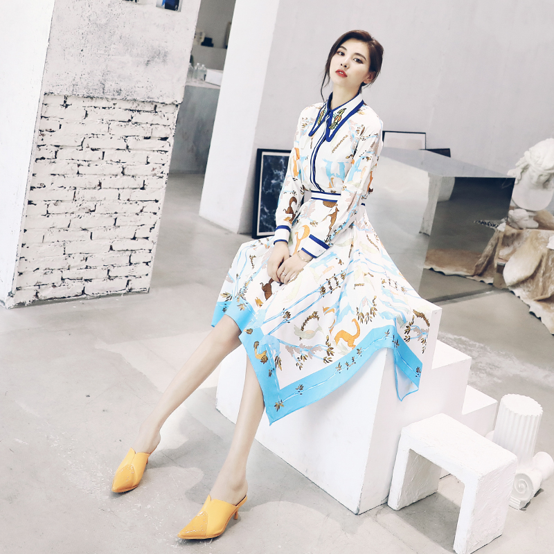 2018秋季新款印花收腰高端名媛氣質長袖襯衫上衣不規則半身裙套裝
