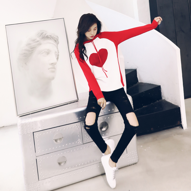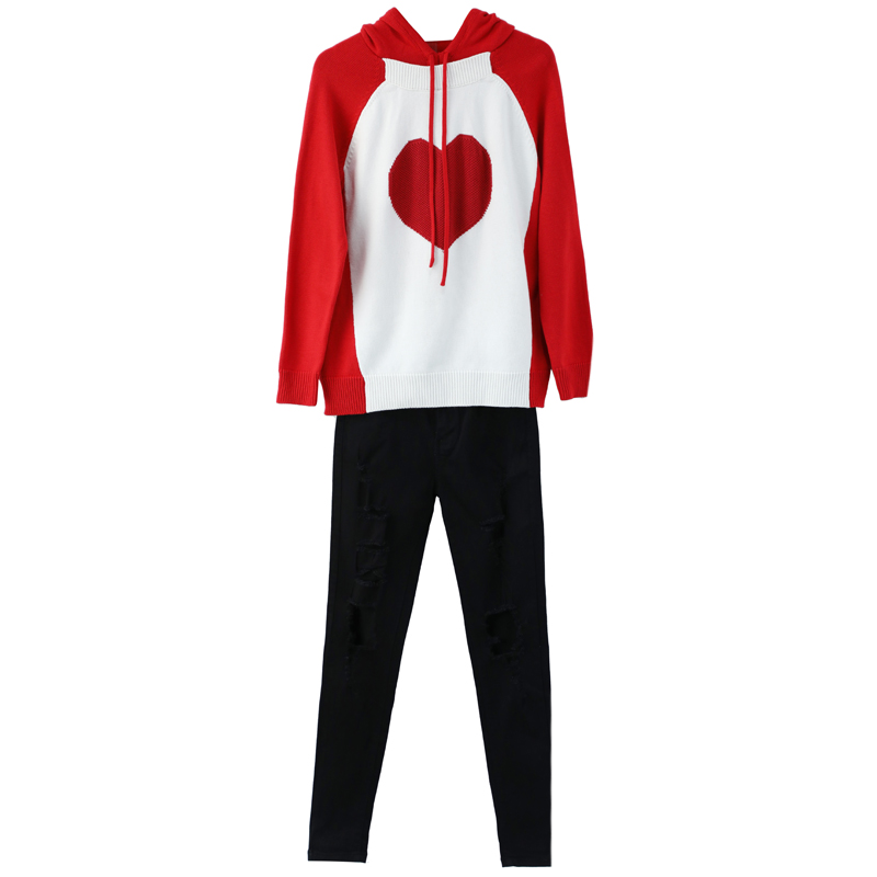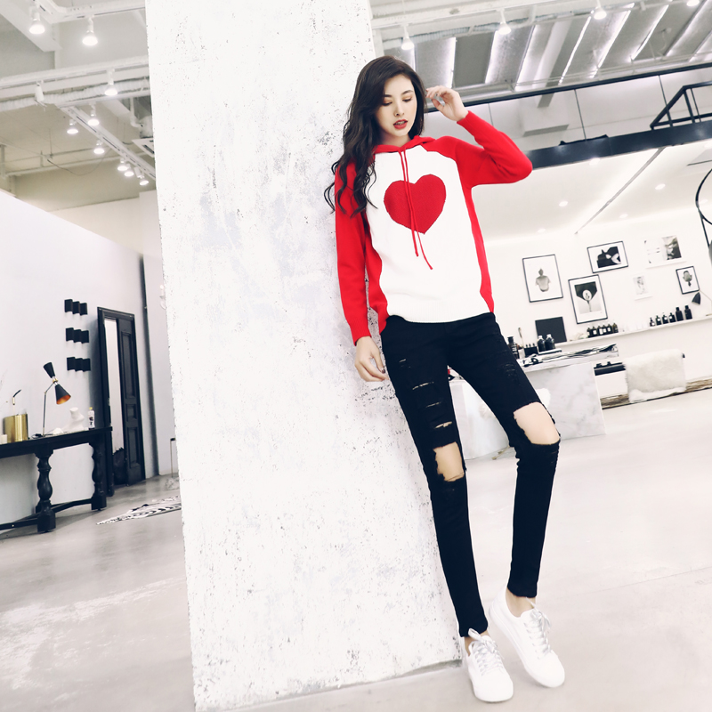 2018新款洋氣套裝女秋裝氣質針織衫長袖上衣牛仔破洞小腳褲兩件套