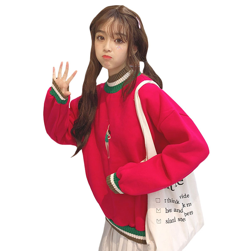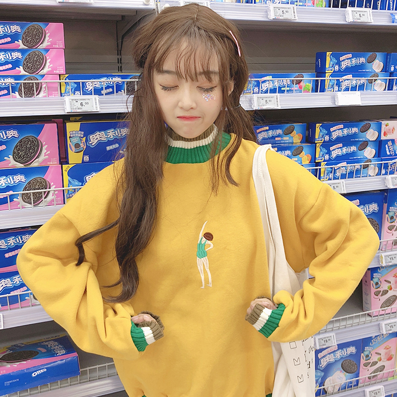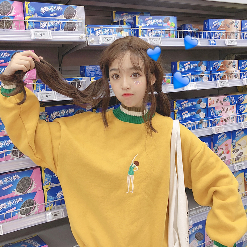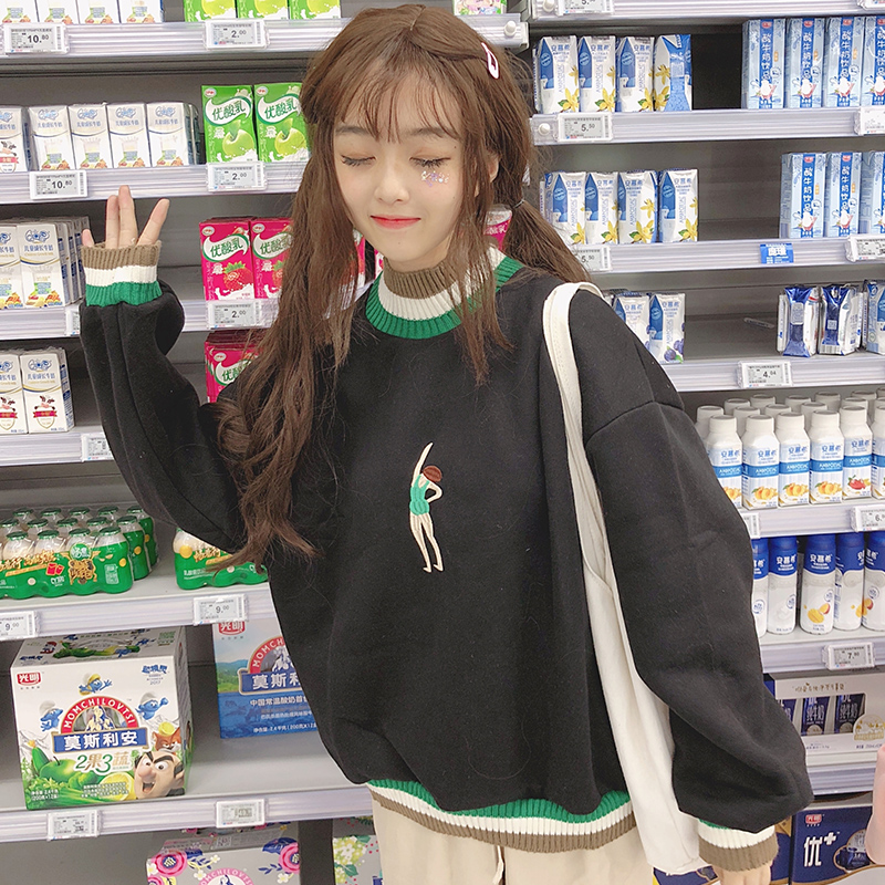 / 秋冬韓版慵懶風可愛小人刺繡加絨加厚寬松長袖套頭超火衛衣外套女