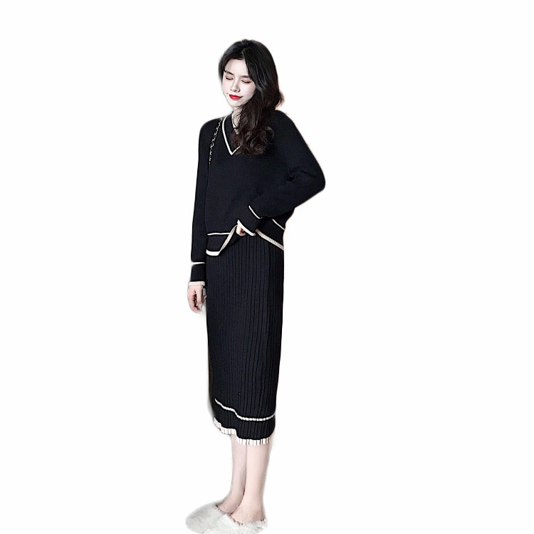 復古韓國chic風小香風寬松V領針織百褶連衣裙氣質套裝時尚兩件套