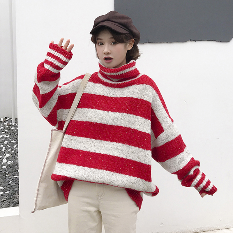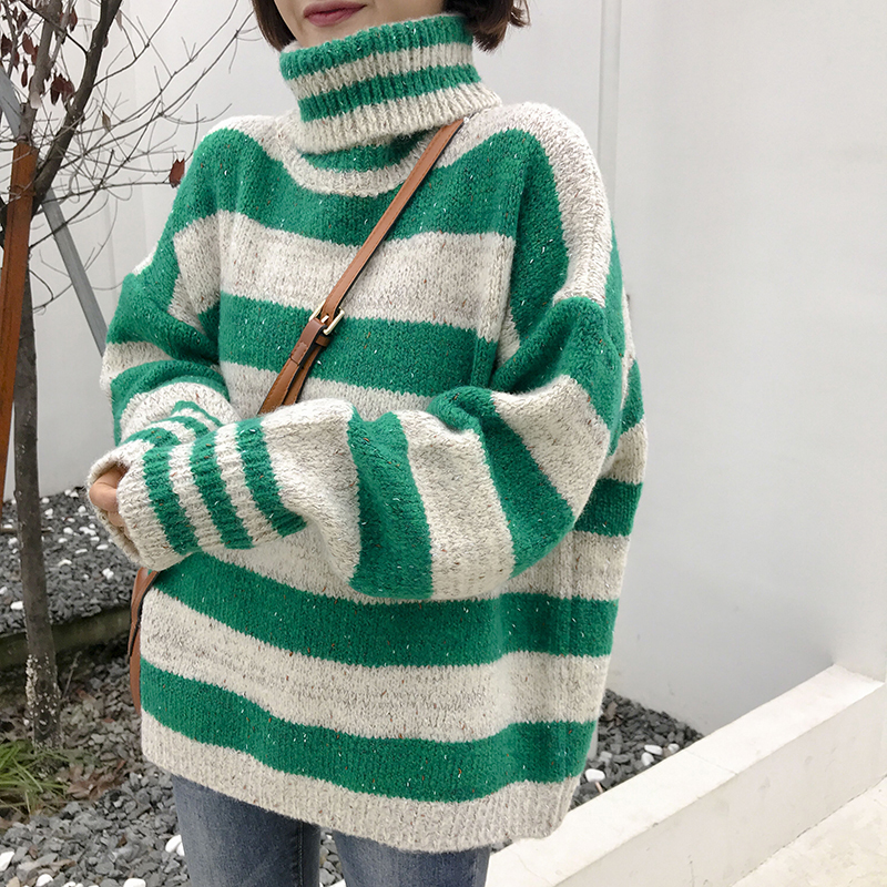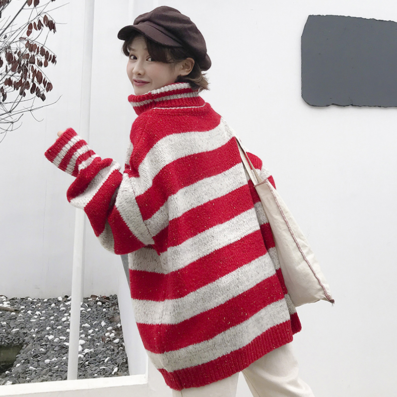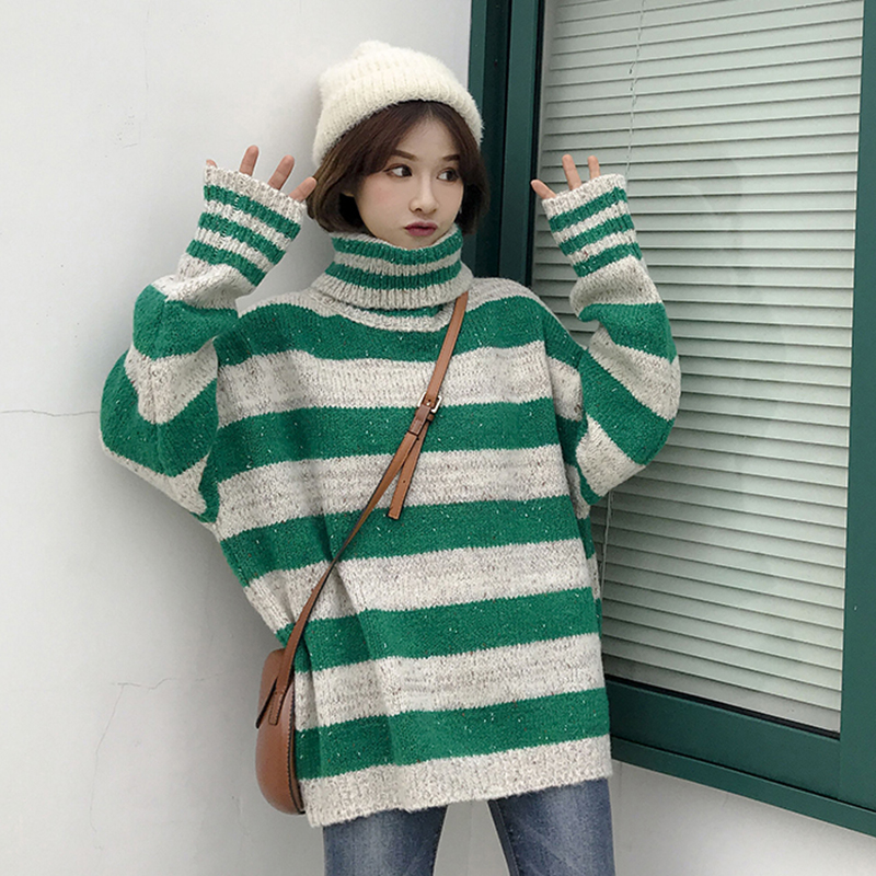 慵懶風高領毛衣外套女秋冬裝2018新款韓版寬松百搭條紋長袖針織衫
