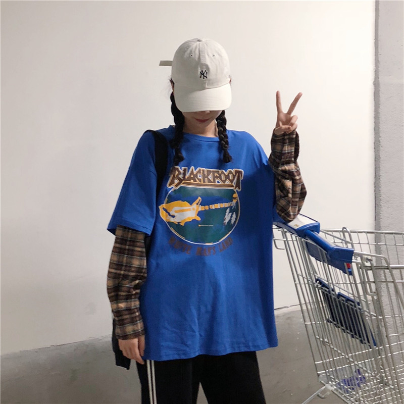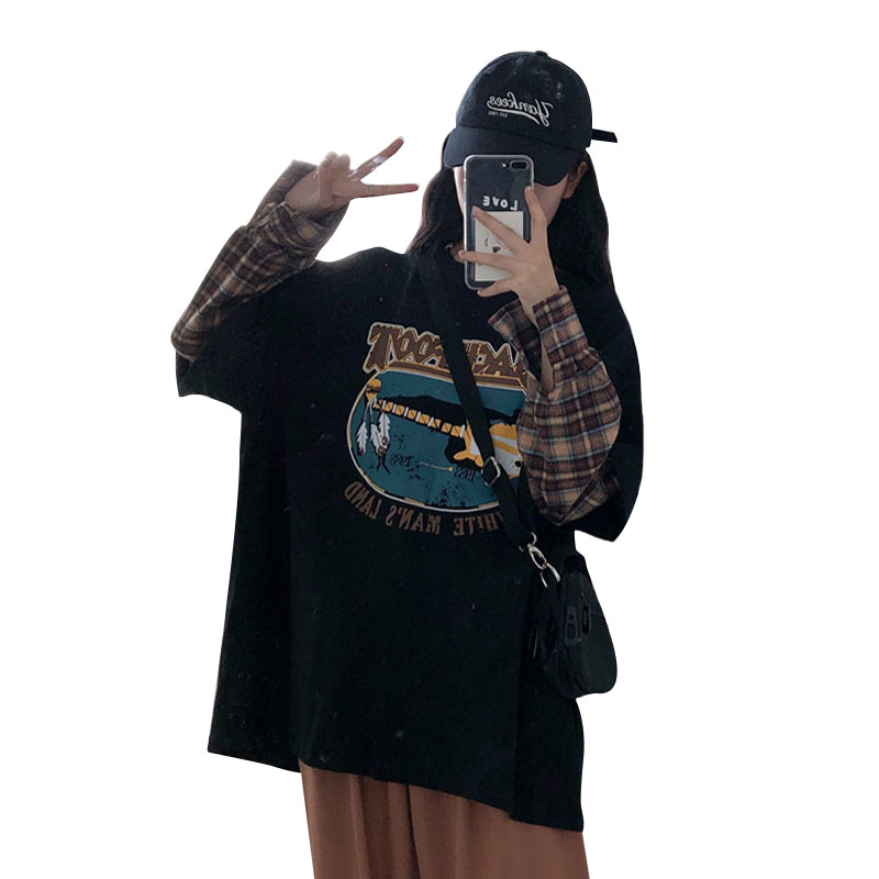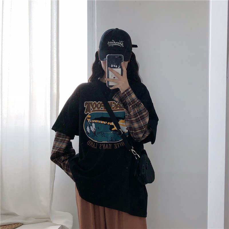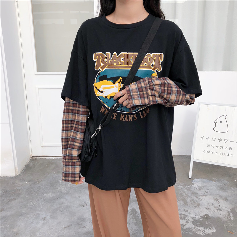 / 秋季女裝韓版中長款原宿風寬松假兩件字母拼接格子長袖T恤上衣潮