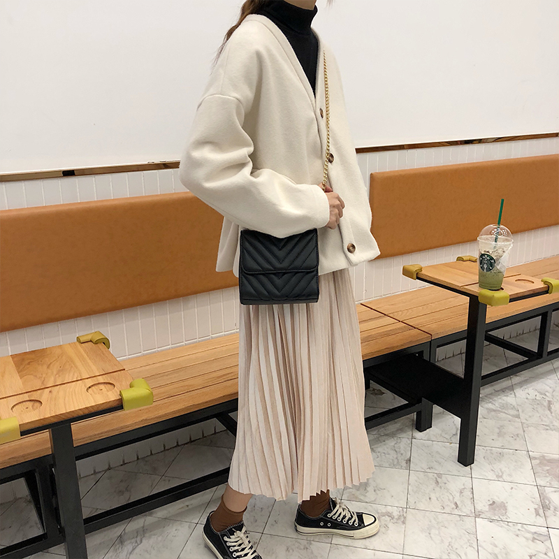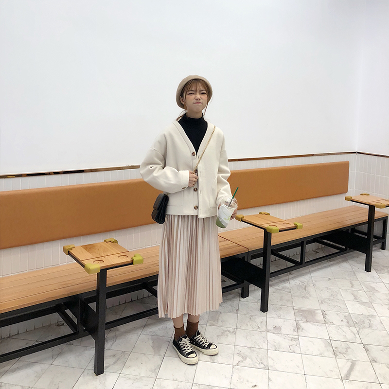 / 韓版時尚休閑套裝秋季女裝寬松V領呢子開衫外套+百褶半身裙兩件套