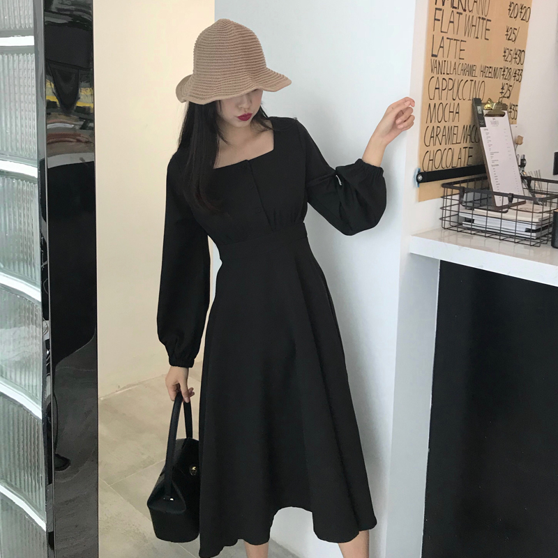 2018新款韓范復古百搭時尚中長款收腰長袖連衣裙方領燈籠袖A字裙