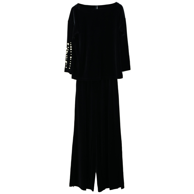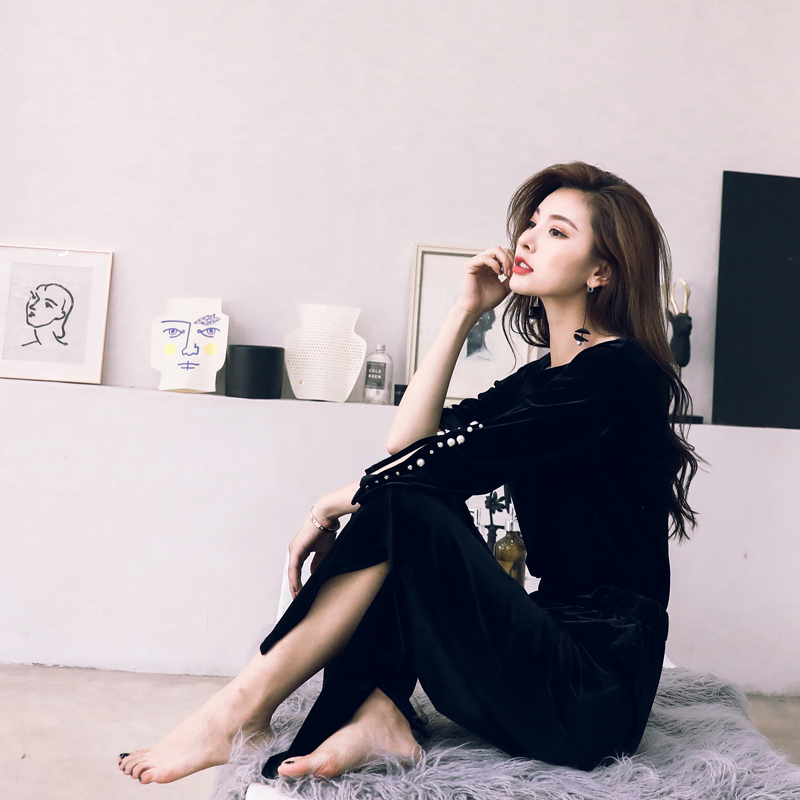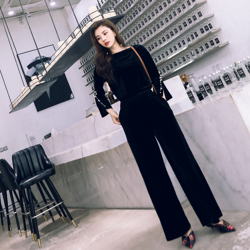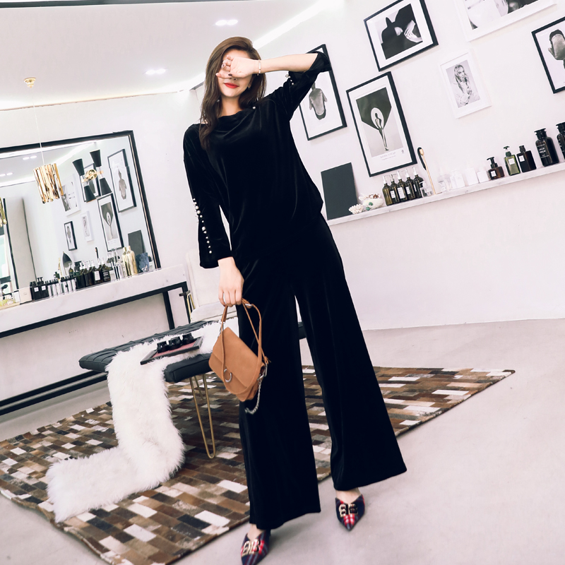 / 名媛休閑氣質寬松上衣歐洲站絲絨開叉闊腿褲兩件套收腰顯瘦套裝女
