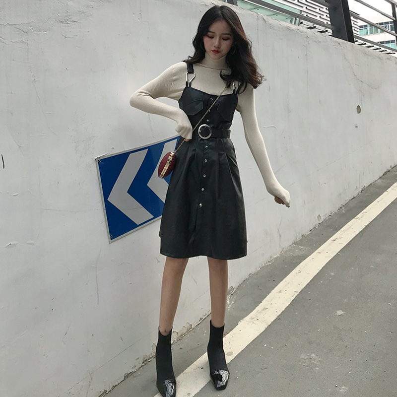 港風時尚秋冬新款韓版套裝背帶連衣皮裙長袖修身打底針織衫兩件套