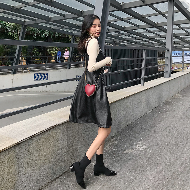 / 港風時尚秋冬新款韓版套裝背帶連衣皮裙長袖修身打底針織衫兩件套